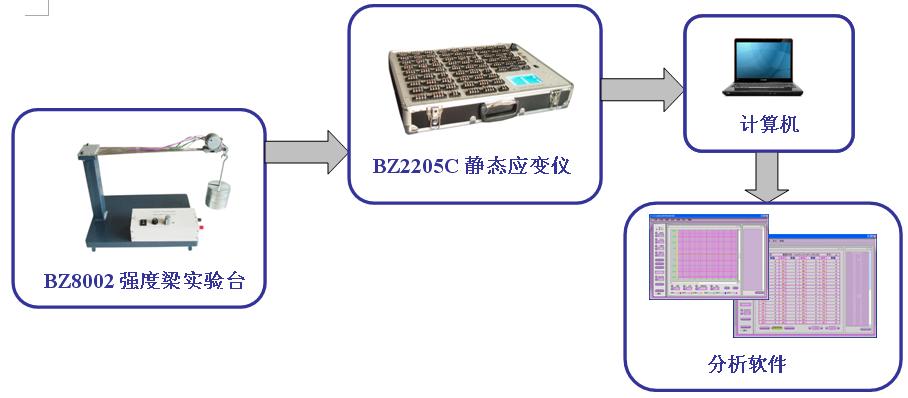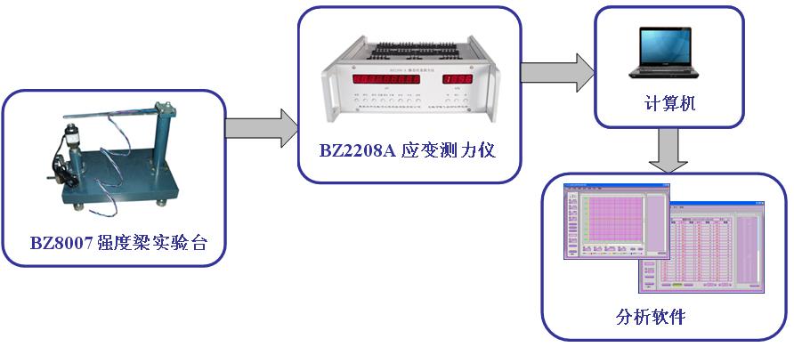 手輪加載靜態(tài)系統(tǒng)圖: BZ8007等強(qiáng)度梁實(shí)驗(yàn)臺(tái)--BZ2208A靜態(tài)應(yīng)變測(cè)力儀--計(jì)算機(jī)--分析軟件