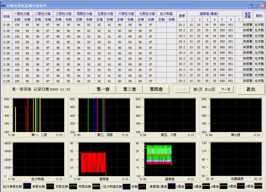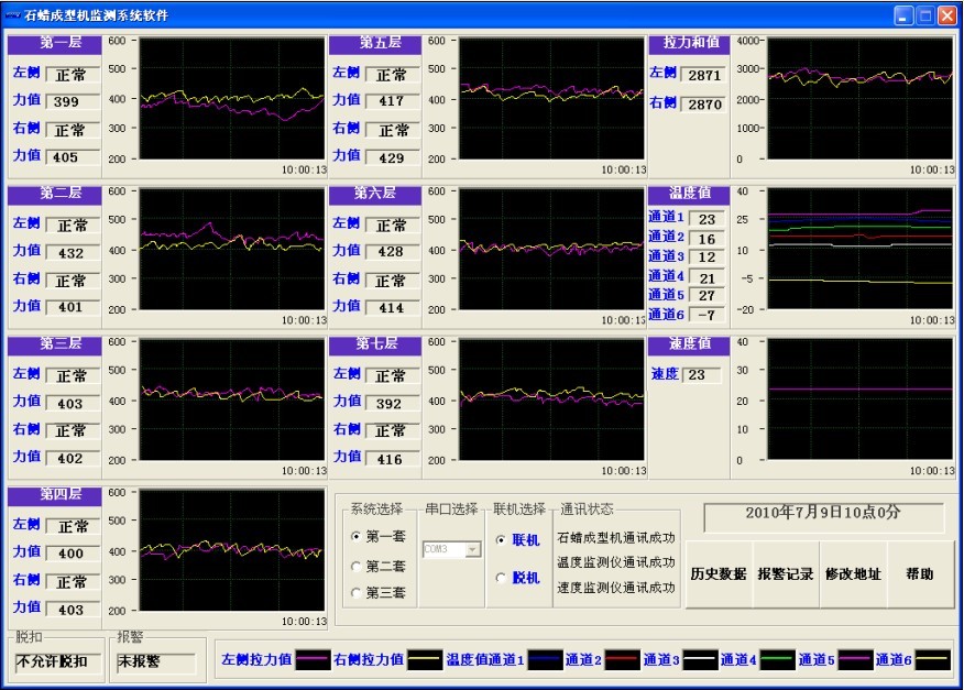 公司研發(fā)的物聯(lián)網(wǎng)產(chǎn)品在石化行業(yè)應(yīng)用的主要有石蠟成型機(jī)在線監(jiān)測(cè)系統(tǒng),獲得了用戶的廣泛好評(píng)。石蠟成型機(jī)在線監(jiān)測(cè)系統(tǒng)主要監(jiān)測(cè)設(shè)備三方面的參數(shù)。 一、監(jiān)測(cè)鏈條的拉力 我國(guó)大型煉油廠在煉油的同時(shí)會(huì)產(chǎn)生副產(chǎn)品-----石蠟,而石蠟成型的過程是由熱的液體逐漸變成固體的緩慢過程,其特點(diǎn)一是成型在溫度零度以下的冷室進(jìn)行,無(wú)人值守;二是運(yùn)送蠟盤的鏈條共計(jì)七層700米長(zhǎng),很容易形成兩邊鏈條不同步,從而造成蠟盤在運(yùn)動(dòng)過程中卡盤致使蠟盤卡壞,甚至造成鏈條拉伸損壞整機(jī)框架變形。因工人不在冷室內(nèi),看不到卡盤的情況,所以因卡盤而停工的現(xiàn)象經(jīng)常發(fā)生?ūP的原因很多,如鏈條過松,過緊,鏈條磨損伸長(zhǎng),兩邊鏈條拉力不勻,鏈節(jié)長(zhǎng)度不等,不對(duì)稱,齒輪磨損等。我公司研發(fā)生產(chǎn)的BZ2231A型石蠟成型機(jī)監(jiān)測(cè)系統(tǒng)在石蠟成型機(jī)的14個(gè)彈簧拉桿上安裝了14支拉力傳感器,以此來(lái)監(jiān)測(cè)七層鏈條中每層兩邊的拉力值,只要同一層的兩根鏈條力值基本相等,也就是說(shuō)兩根鏈條基本同步就不會(huì)發(fā)生卡盤現(xiàn)象。由傳感器監(jiān)視鏈條張緊程度的變化,當(dāng)傳感器受張緊狀態(tài)變化時(shí),內(nèi)部電路發(fā)出相應(yīng)的變化信號(hào),經(jīng)電纜傳送到監(jiān)測(cè)系統(tǒng)主機(jī),主機(jī)B由14個(gè)通道和單片計(jì)算機(jī)及顯示單元組成,傳感器輸出信號(hào)由通道進(jìn)行放大,抗干擾處理后輸出給單片計(jì)算機(jī)單元,計(jì)算機(jī)將信號(hào)進(jìn)行采樣、分析后送主機(jī)A。例如,鏈條張緊程度適中,計(jì)算機(jī)將循環(huán)檢測(cè)7層14個(gè)測(cè)點(diǎn),并顯示被測(cè)值,液晶上相應(yīng)測(cè)點(diǎn)無(wú)附加文字,表示工作正常;當(dāng)鏈條張緊程度太松時(shí),顯示值變小,液晶上相應(yīng)測(cè)點(diǎn)顯示“力小”,表示該測(cè)點(diǎn)應(yīng)調(diào)緊鏈條到正常值;當(dāng)鏈條張緊程度太緊時(shí),顯示值變大,液晶上相應(yīng)通道顯示“預(yù)警”,表示該測(cè)點(diǎn)應(yīng)調(diào)松鏈條到正常值;當(dāng)出現(xiàn)卡盤事故時(shí),某層鏈條張力逐漸增大,迅速超過報(bào)警值,顯示這一層的報(bào)警值及“報(bào)警”,并依據(jù)報(bào)警允許的條件報(bào)警停機(jī)。我們根據(jù)實(shí)際情況設(shè)定14點(diǎn)的預(yù)警值和報(bào)警值,系統(tǒng)主機(jī)設(shè)在工人的操作室,發(fā)生問題時(shí)該系統(tǒng)會(huì)預(yù)警或報(bào)警,工人可以輕松地將問題解決在萌芽狀態(tài)。 根據(jù)成型機(jī)工作狀態(tài),利用鏈條張緊程度來(lái)反映機(jī)器的運(yùn)行狀態(tài)及卡盤故障是本系統(tǒng)的關(guān)鍵,實(shí)踐證明是行之有效的,不但可以監(jiān)視任何位置卡盤故障的發(fā)生,而且可以對(duì)整機(jī)良好狀態(tài)的運(yùn)行給予準(zhǔn)確的反映。 本系統(tǒng)測(cè)鏈條拉力有如下特點(diǎn): 1、合理配置參數(shù),使成型機(jī)工作在正常運(yùn)行狀態(tài)。 保證成型機(jī)無(wú)故障隱患地工作在正常運(yùn)行狀態(tài)是本系統(tǒng)的特點(diǎn),根據(jù)成型機(jī)機(jī)型、新舊程度、現(xiàn)場(chǎng)情況確定本系統(tǒng)工作參數(shù),同時(shí)按系統(tǒng)數(shù)據(jù)進(jìn)行成型機(jī)平衡調(diào)節(jié),使成型機(jī)工作在良好狀態(tài)(如鏈條松緊適度,左右張力適當(dāng),合力相等),卡盤故障將不會(huì)發(fā)生,保證成型機(jī)運(yùn)行完好,生產(chǎn)順利進(jìn)行。 2、監(jiān)視卡盤故障發(fā)展趨勢(shì),及時(shí)向使用者提供數(shù)據(jù)和預(yù)報(bào)。 成型機(jī)長(zhǎng)時(shí)間工作,由于機(jī)械磨損或其它原因,可能會(huì)引起其它參數(shù)的變化,如果不及時(shí)調(diào)整和修正,久而久之將會(huì)造成嚴(yán)重的卡盤。成型機(jī)原來(lái)的報(bào)警裝置中沒有這些功能,所以無(wú)法知道從正常工作到卡盤的發(fā)展趨勢(shì),也就不可避免的出現(xiàn)卡盤事故。本系統(tǒng)為使用者提供了精確直觀的參數(shù)及預(yù)警指示,使用者可將成型機(jī)變化的參數(shù)及時(shí)調(diào)整好,使成型機(jī)總是工作在正常運(yùn)行狀態(tài)。 意外地出現(xiàn)卡盤、卡鏈條等故障,本系統(tǒng)立即報(bào)警停機(jī),顯示故障位置,減小故障損失。 傳感器安裝極為方便,不改變成型機(jī)原來(lái)的任何功能和狀態(tài)。 3、為成型機(jī)檢修、調(diào)試工作帶來(lái)極大方便。 成型機(jī)檢修工作量較大,調(diào)試具有一定難度,檢修周期較長(zhǎng)。以本系統(tǒng)顯示數(shù)據(jù)為依據(jù),使調(diào)試準(zhǔn)確、迅速,工作效率大大提高。 4、利用特別技術(shù)設(shè)計(jì)的線路故障自檢功能,使本系統(tǒng)具有高可靠性。 本系統(tǒng)對(duì)七層十四個(gè)測(cè)點(diǎn)的傳感器、電纜、連接器的任何損壞都可以實(shí)時(shí)反應(yīng)和處理,對(duì)非正常信號(hào)可以準(zhǔn)確區(qū)分是自身系統(tǒng)故障還是被監(jiān)測(cè)的成型機(jī)故障。如同一個(gè)“生命體”,對(duì)伸出